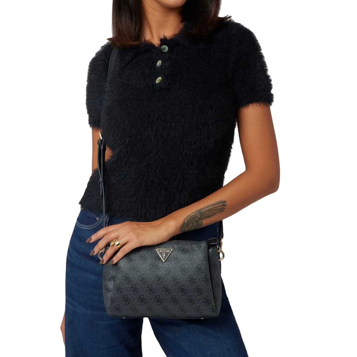 - GUESS logo plaque on the front