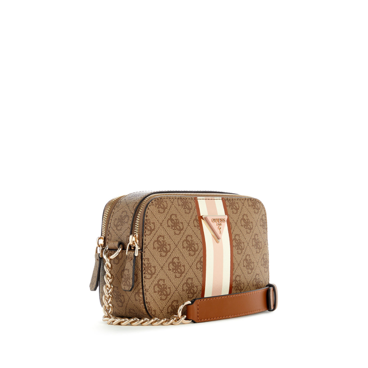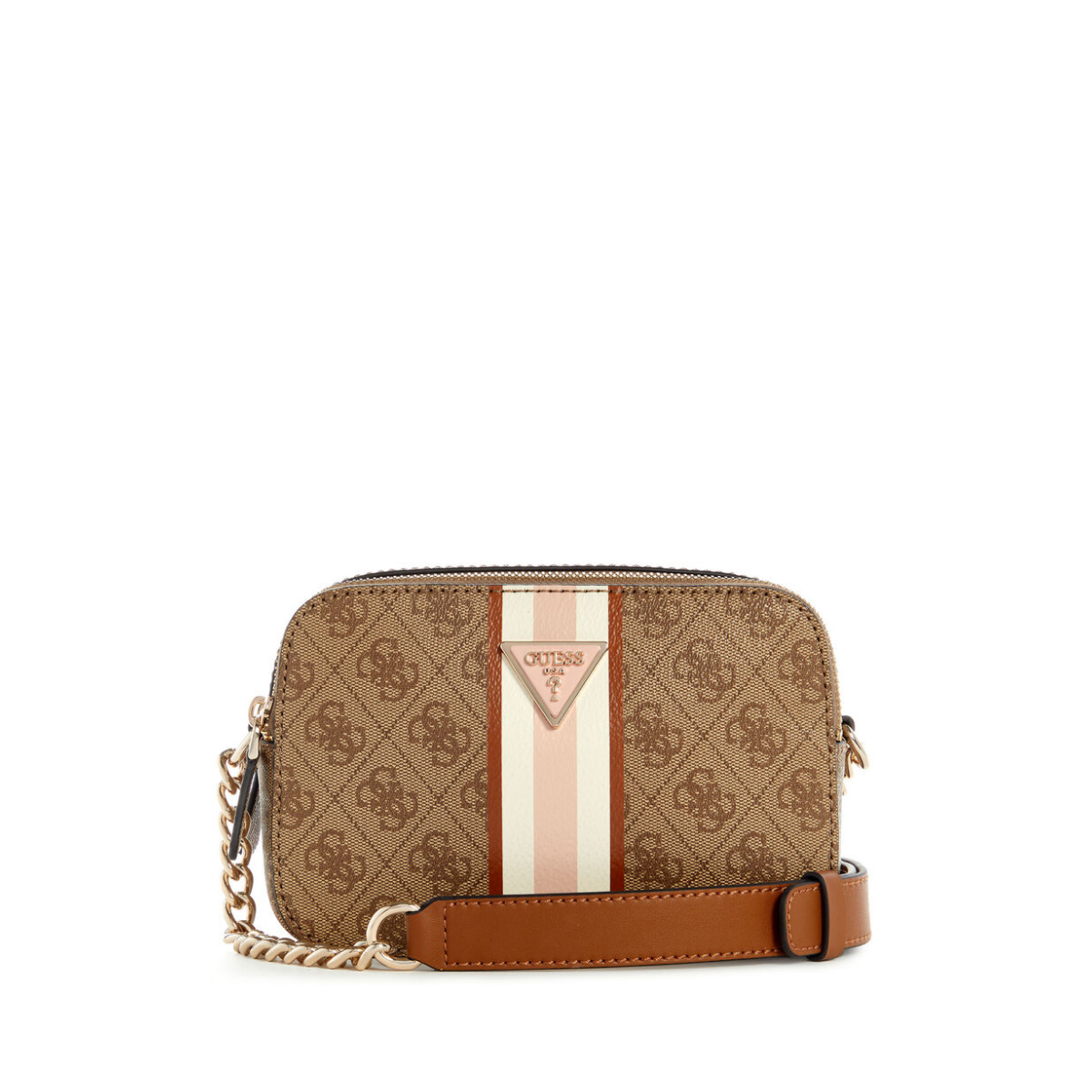 Get ready to upgrade your style game with the Guess Noelle Stripes Camera Crossbody bag. This chic bag boasts a top zip closure and a chain crossbody strap for easy access and hands-free convenience. The stripe detail adds a touch of uniqueness. This bag is the perfect mix of functionality and fashion.