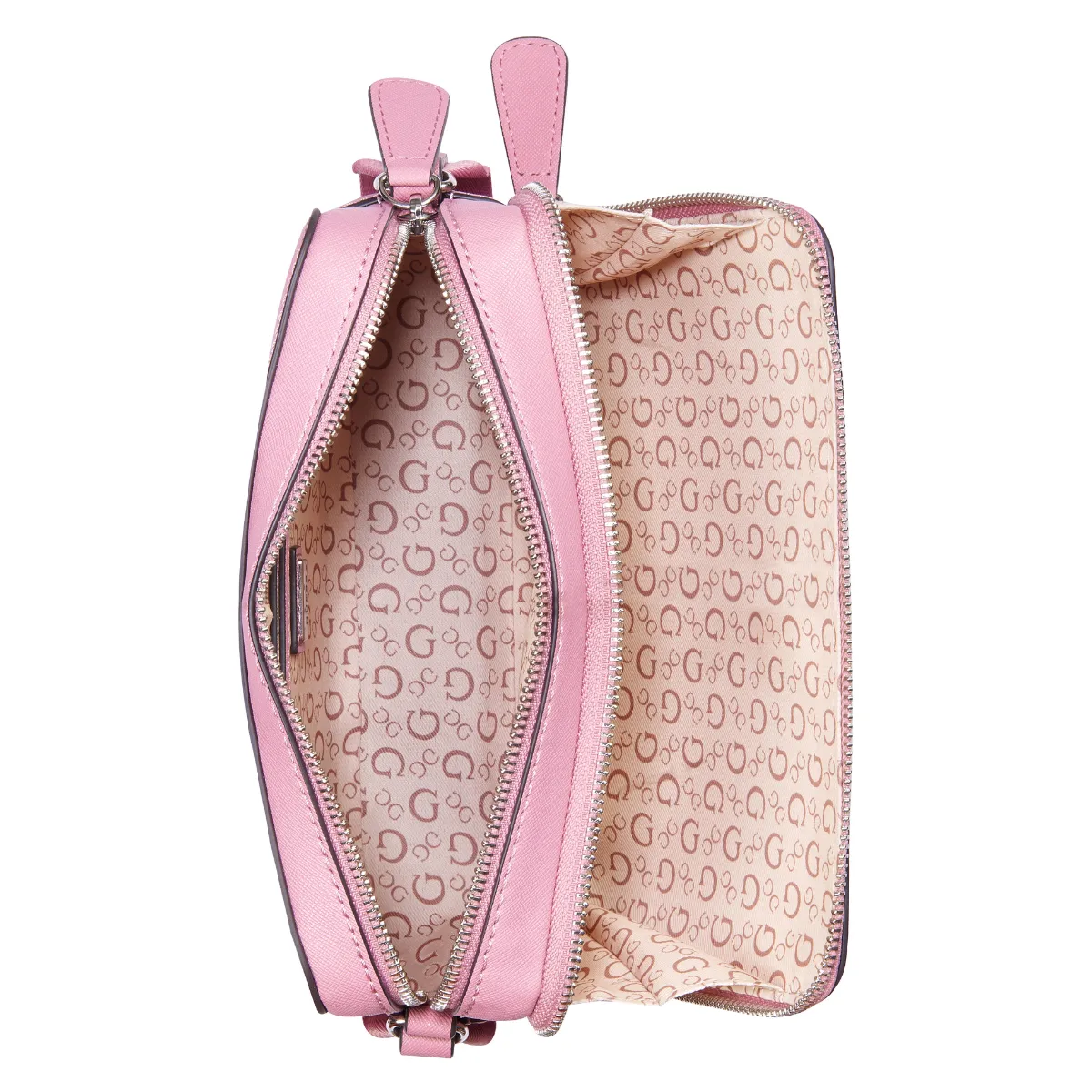 Genuine Guess crossbody with double zip compartments—efficient, stylish, and surprisingly roomy