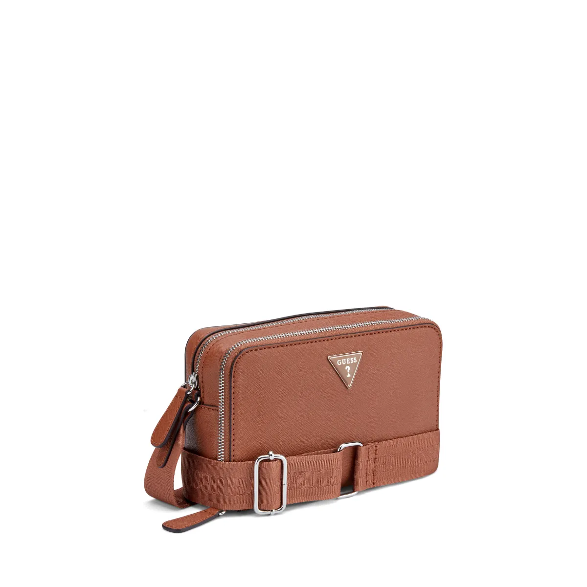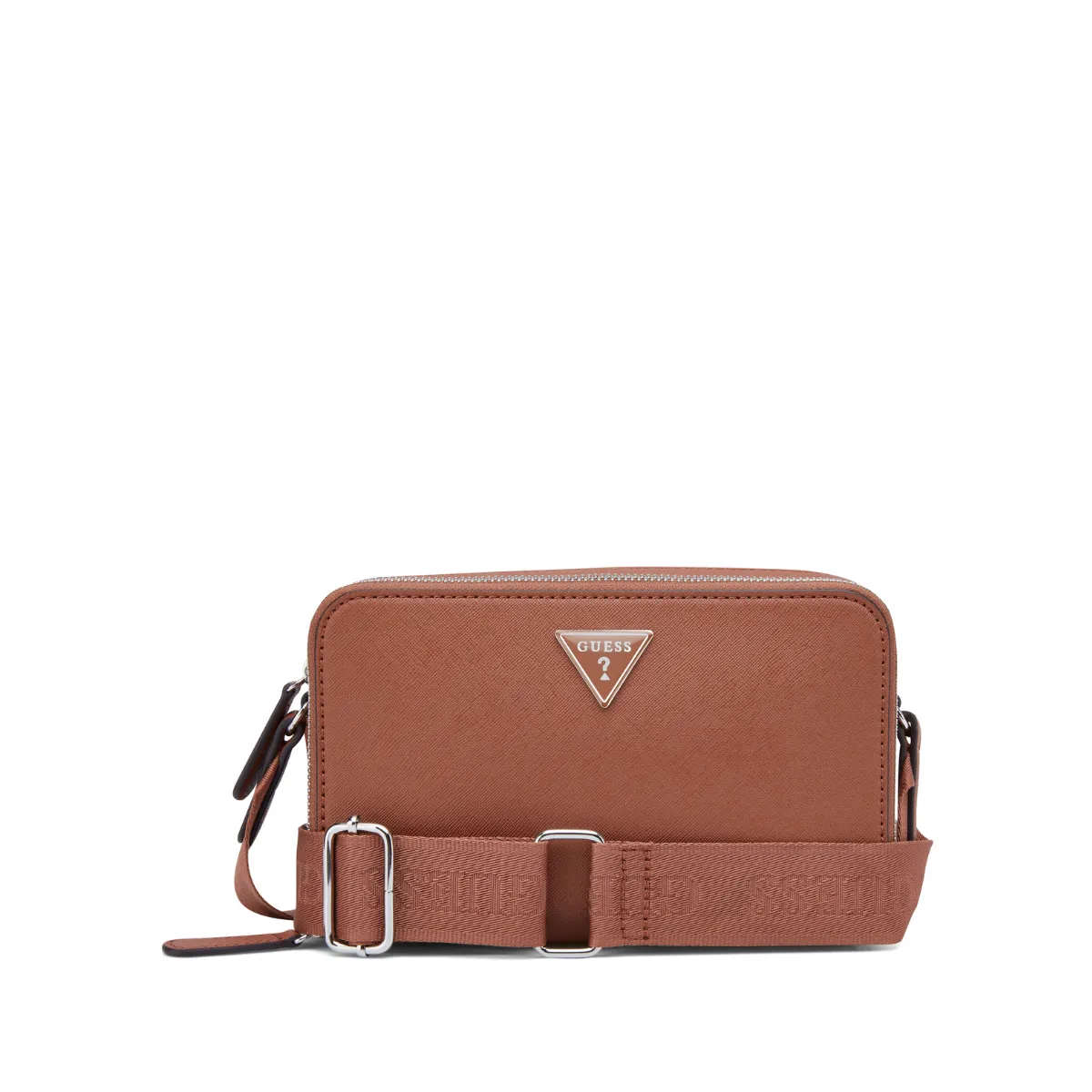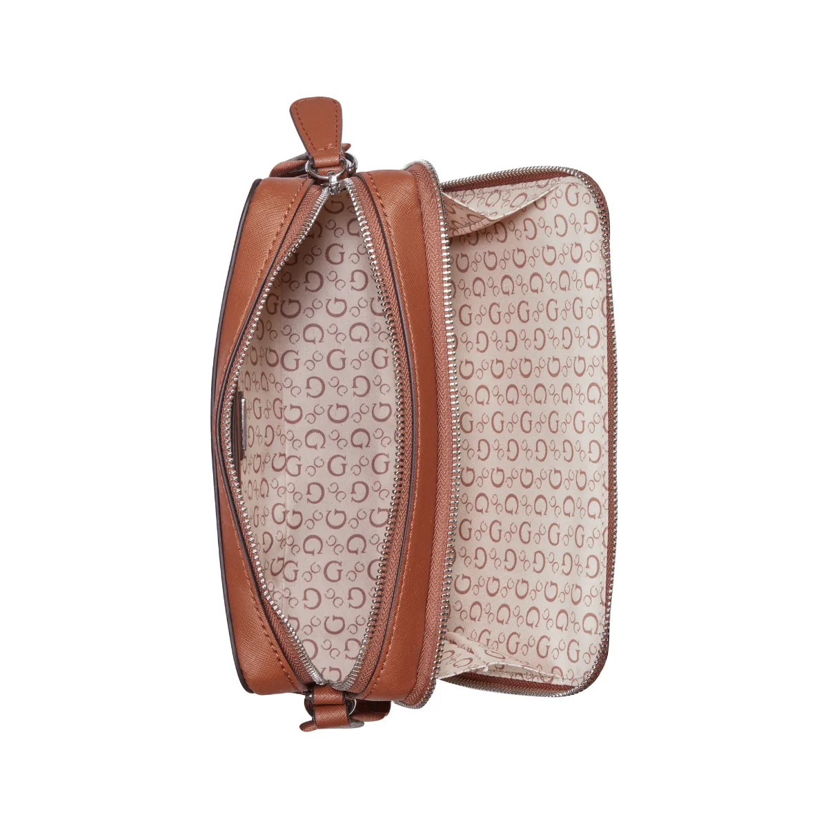 Genuine Guess crossbody with double zip compartments—efficient, stylish, and surprisingly roomy