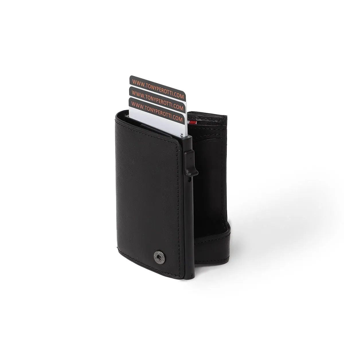 The Tony Perotti Furbo Card Holder with Coin Pocket is an ideal replacement for the traditional wallet, boasting a compact size that fits comfortably in any trouser pocket or handbag. Crafted from naturally tanned Italian cow leather, this card holder combines elegance with functionality. It includes an aluminum die-cast card holder with a popup system designed to accommodate 4 to 6 cards or credit cards.